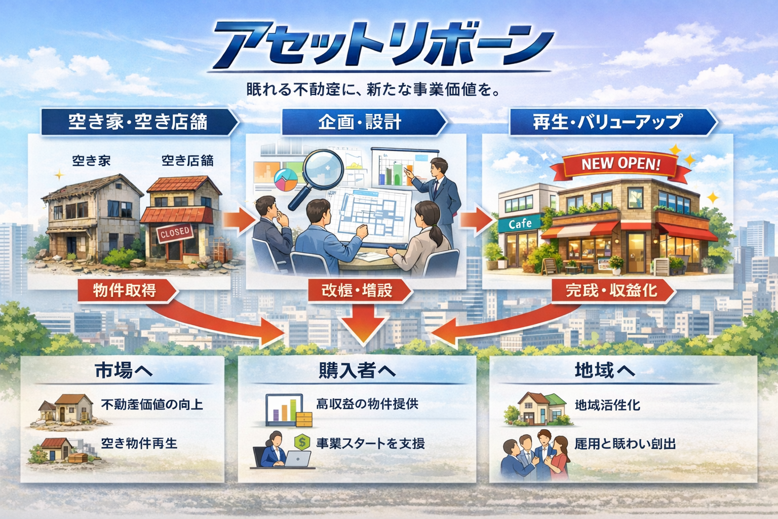 単なる安価取得・短期転売ではなく、対象不動産に対し、用途変更、動線改善、区画再編、外観刷新、店舗増設、収益導線の再設計などを実施することで、不動産を「使われる資産」へ再構築する価値創造型ビジネスとして展開する。