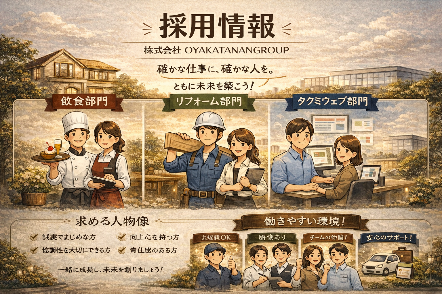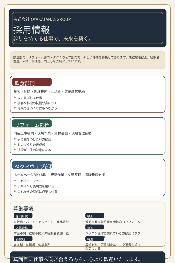 株式会社 OYAKATANANGROUP は、飲食・リフォーム・ウェブ制作をはじめとする各事業を通じて、